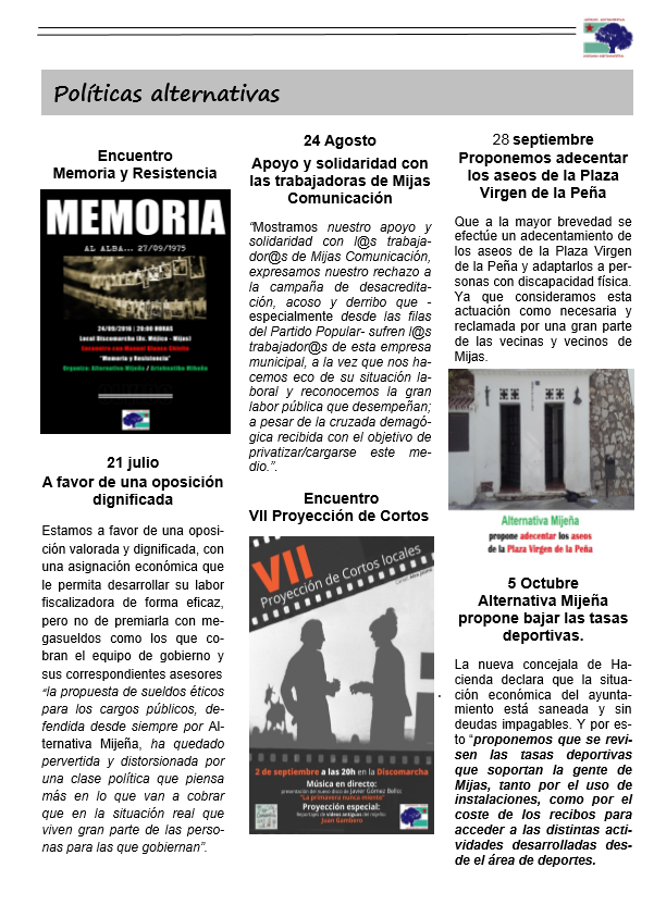 El Alternativo #3 Consigue el nuevo número de El Alternativo -boletín informativo de Alternativa Mijeña- con actividades del partido, Encuentros con la Gente, Agenda, y Artículos Libres.